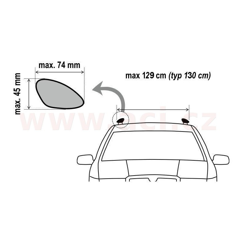 - Pro vozy s roztečí podélných nosičů: max. 129 cm